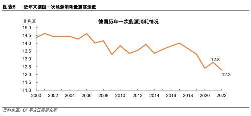 1)能源消費(fèi)方面,2022年德國一次能源消費(fèi)量同比下降3.8%,降至12.3艾焦耳;2022年德國天然氣消費(fèi)量同比下降15.2%,降至2.8艾焦耳。