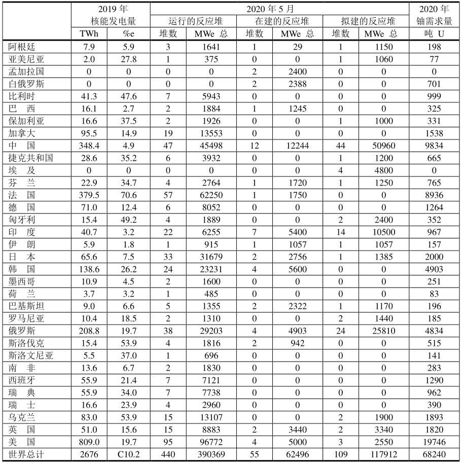 表中“%e”表示核能發(fā)電占發(fā)電總量的百分率。全球核能發(fā)電占全球發(fā)電總量的10.2%,其中法國高達(dá)70.6%。本數(shù)據(jù)是世界核能協(xié)會(huì)WNA 2020年5月份提供的數(shù)據(jù)。