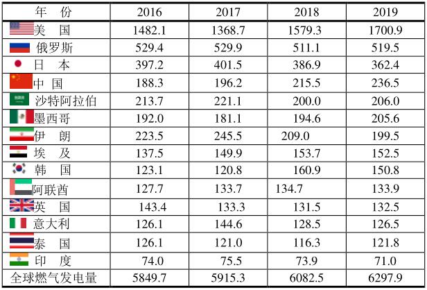 2016~2019年前14位燃?xì)獍l(fā)電最大的國家(單位:TWh)