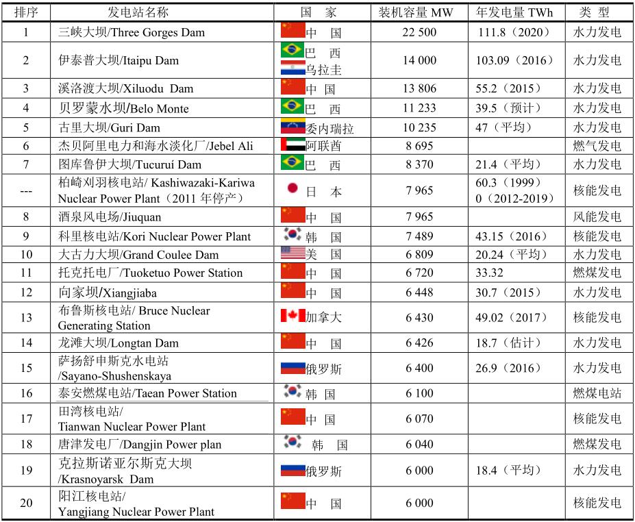 全球前20位發(fā)電站的順序是隨著時(shí)間而變化的,下表是最新的排序。目前全球20席中,中國(guó)占有八席:水力發(fā)電占有4席:三峽大壩、溪洛渡大壩、向家壩和龍灘大壩;燃煤發(fā)電占一席:托克托電廠(chǎng);核能發(fā)電占一席:陽(yáng)江核電站。