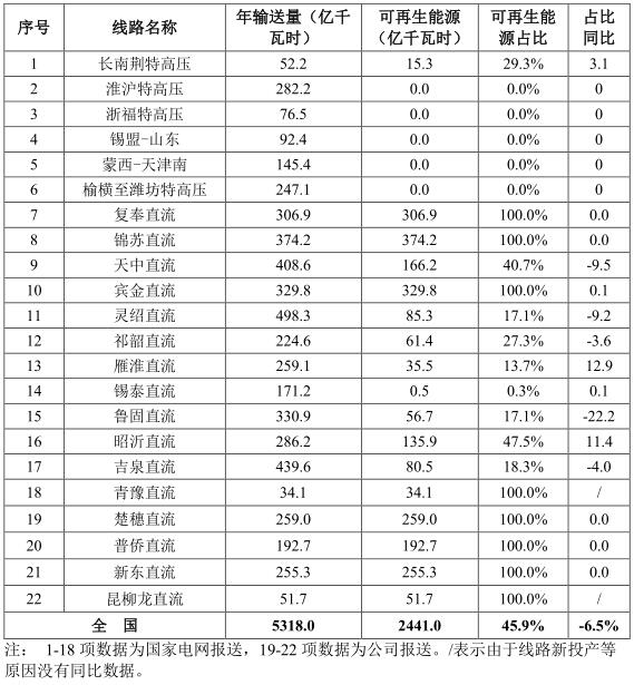 2020年,22條特高壓線路年輸送電量5318億千瓦時(shí),其中可再生能源電量2441億千瓦時(shí),同比提高3.8%,可再生能源電量占全部輸送電量的45.9%。國家電網(wǎng)運(yùn)營(yíng)的18條特高壓線路輸送電量4559億千瓦時(shí),其中可再生能源電量1682億千瓦時(shí),占輸送電量的37%;南方電網(wǎng)運(yùn)營(yíng)的4條特高壓線路輸送電量759億千瓦時(shí),全部為可再生能源電量。