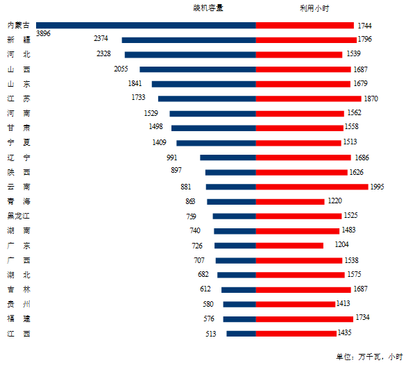 圖3 1-9月份風(fēng)電裝機(jī)較多省份風(fēng)電裝機(jī)容量和設(shè)備利用小時
