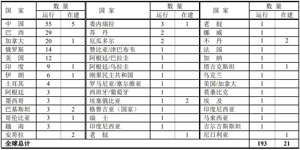 世界各國裝機(jī)容量在1000MW以上水電站數(shù)