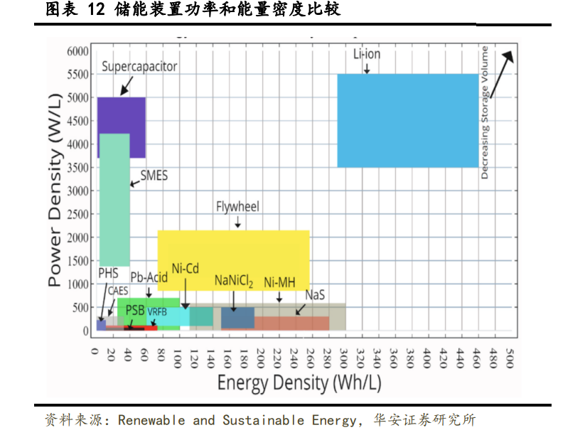 抽水蓄能占據(jù)儲(chǔ)能絕對(duì)份額,鋰離子電池是電化學(xué)儲(chǔ)能主流技術(shù)路線。結(jié)果表明, 通過對(duì)不同儲(chǔ)能技術(shù)的功率和能量密度的比較,可以確定儲(chǔ)能裝置的尺寸。儲(chǔ)能裝置的體積隨著功率和能量密度的增加而減小,因此鋰離子電池可以獲得更小的尺寸。另一方 面,左下角顯示了更大體積的儲(chǔ)能設(shè)備。所有熱儲(chǔ)能和電化學(xué)儲(chǔ)能裝置(Ni-MH, Na-S, Li-ion & NaNiCl2)的能量密度都高于其他儲(chǔ)能裝置。 相反,SCES、SMES 和 FES 的功率密度高于其他儲(chǔ)能設(shè)備類型。此外,CAES 和 PHS 的 能量密度最小,同時(shí),CAES、PHS、VRFB、PSB 和 Zn Br 提供的功率密度也最小。