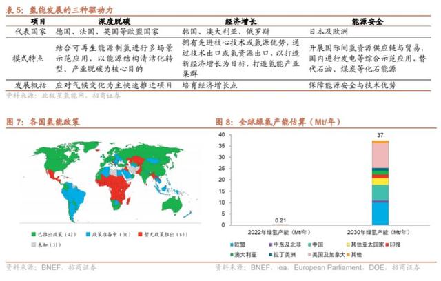 海外各國(guó)加速綠氫布局。脫碳發(fā)展逐漸成為世界各國(guó)共識(shí),超過(guò) 130 多個(gè)國(guó)家和地區(qū)提出了碳中和目標(biāo),氫能等新興能源技術(shù)加速推進(jìn),包括日本、德國(guó)、美國(guó)、中國(guó)等在內(nèi)的 42 個(gè)國(guó)家和地區(qū)都已經(jīng)推出氫能政策,36 個(gè)國(guó)家和地區(qū)的氫能政策也正在籌備中。各國(guó)發(fā)展氫能的驅(qū)動(dòng)力分為三大方面:深度脫碳、保障能源安全和實(shí)現(xiàn)經(jīng)濟(jì)增長(zhǎng)。由于電解制氫碳排放低,純度品質(zhì)更高,隨著電解槽成本與可再生能源發(fā)電成本不斷下降,未來(lái)電解制取綠氫有望成為主流制氫手段。各國(guó)在氫能政策中均著重提出要加速布局可再生能源電解制備綠氫,2022 年全球綠氫產(chǎn)能約為 21 萬(wàn)噸/年,預(yù)計(jì)到 2030 年,全球綠氫產(chǎn)能將超過(guò) 3600 萬(wàn)噸/年。