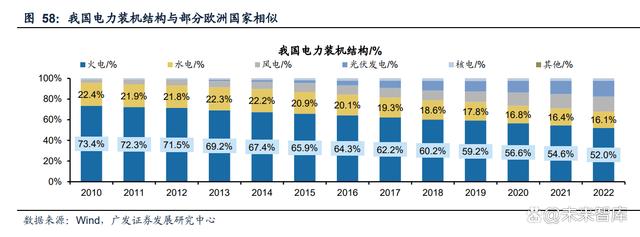 部分歐洲國家與我國電力結(jié)構(gòu)相似,能源轉(zhuǎn)型過程值得借鑒。從我國電力裝機(jī)結(jié)構(gòu)來看,過去我國以傳統(tǒng)電源火電、水電為主,2010年兩者裝機(jī)占比96%,風(fēng)光等可 再生能源逐漸成為發(fā)展重點(diǎn),水電、火電裝機(jī)占比下降,2022年火電裝機(jī)占比52%, 水電開發(fā)已進(jìn)入后半程增量有限,風(fēng)光成為新增裝機(jī)主力,這與部分歐洲國家如德 國、波蘭頗為相似,2022年德國煤電發(fā)電量占比已經(jīng)降至31%,風(fēng)光發(fā)電量占比提 升至32%,其能源轉(zhuǎn)型走在我國之前。隨著我國提出雙碳目標(biāo),風(fēng)光占比提升成為 必然趨勢,德國等歐洲國家能源轉(zhuǎn)型過程中的經(jīng)驗(yàn)對我國有重要的借鑒意義。
