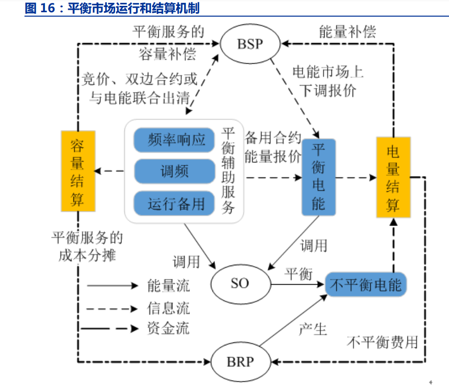 歐洲的平衡市場源于 2017 年 12 月 23 日歐盟委員會 EB 條例,該條例給出一個指導(dǎo) 方針,使得各國可以在平衡市場中共享資源,從而使發(fā)電量始終與用電量相等。從實際達 成的效果來看,歐洲平衡市場與我國的調(diào)頻輔助服務(wù)類似。 在平衡市場中,調(diào)度智能歸于 TSO 或者 DSO,參與平衡市場運行和結(jié)算的市場成員 包括 BSP(BalanceServiceProvider,BSP)和 BRP(BalanceResponsibilityParty,BRP) 等。其中 BSP 提供平衡資源,在實際運行中根據(jù)系統(tǒng)頻率變化或調(diào)度指令改變自身出力以 幫助系統(tǒng)恢復(fù)平衡,BRP 是承擔(dān)責(zé)任并參與不平衡結(jié)算的市場成員。