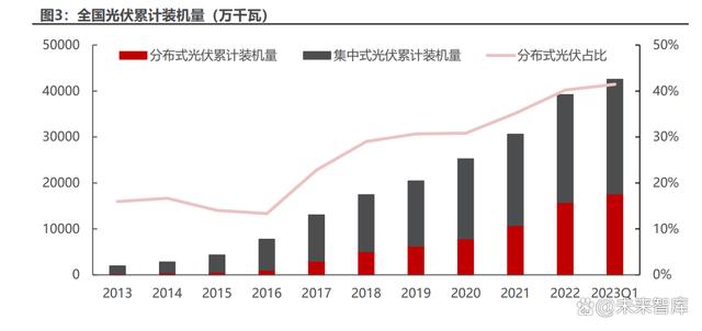 我國分布式光伏累計(jì)裝機(jī)占比逐漸提升。相比于集中式光伏,分布式光伏規(guī)模 較小、輸出電壓功率較小且更接近用戶側(cè),具有投資小、建設(shè)快、占地面積小等優(yōu) 勢。截至 2022 年底,中國光伏累計(jì)裝機(jī)量達(dá) 392GW,其中分布式光伏累計(jì)裝機(jī) 量達(dá) 158GW,占比 40%。