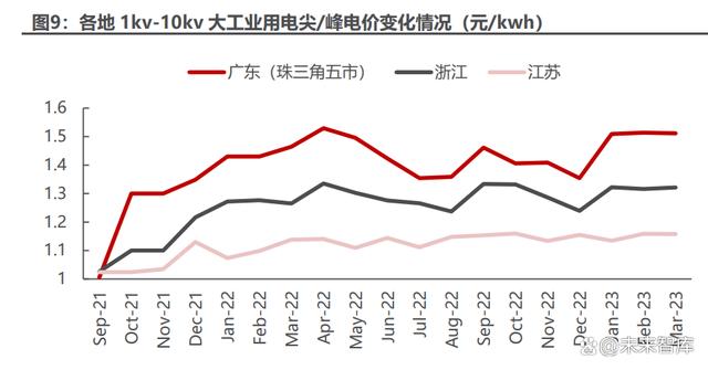 “分時(shí)電價(jià)”、“電力市場化”政策驅(qū)動,大工業(yè)平均用電價(jià)格提高。2021 年 下半年全國大部分省份陸續(xù)出臺分時(shí)電價(jià)政策,調(diào)整峰谷電價(jià)及峰谷時(shí)段,其中以 江蘇、廣東、浙江為例的經(jīng)濟(jì)發(fā)達(dá)省份率先、多次調(diào)整,峰谷價(jià)差有較大幅度的擴(kuò) 大,尖、峰時(shí)段也有不同程度的延長,大工業(yè)平均用電價(jià)格提高。