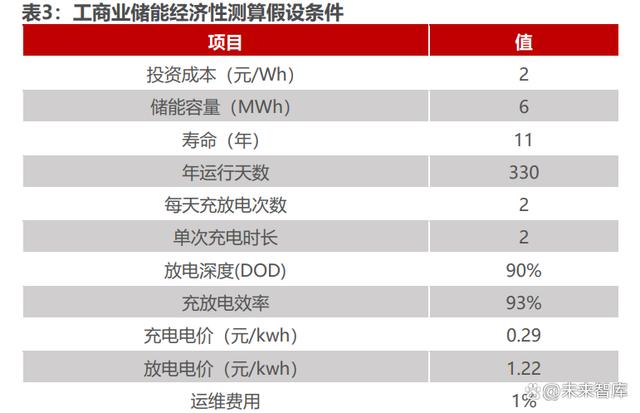 工商業(yè)儲能經(jīng)濟(jì)性測算假設(shè)條件:1)項(xiàng)目案例:浙江 3MW/6.88MWh 用戶 側(cè)儲能系統(tǒng)項(xiàng)目,假設(shè)工廠白天負(fù)荷穩(wěn)定可完全消納儲能放電,且變壓器容量滿足 儲能充電需求;2)項(xiàng)目成本拆分:我們假設(shè)工商業(yè)儲能項(xiàng)目整體投資成本為 2 元 /Wh,其中電池占比 55%,集裝箱占比 15%,BMS 占比 7%;3)運(yùn)行模式:考 慮工廠休息及設(shè)備檢修,儲能設(shè)備每年運(yùn)行 330 天,每天進(jìn)行兩次充放電。第一 次在夜間谷價(jià)充電,在上午尖峰電價(jià)放電 2 小時(shí);第二次在午間谷價(jià)充電 2 小時(shí), 在下午尖峰電機(jī)放電 2 小時(shí);4)峰谷價(jià)差:參考浙江工商業(yè)峰谷電價(jià),假設(shè)尖峰 電價(jià) 1.22 元/KWh,低谷電價(jià) 0.29 元/KWh,峰谷價(jià)差為 0.93 元/KWh。