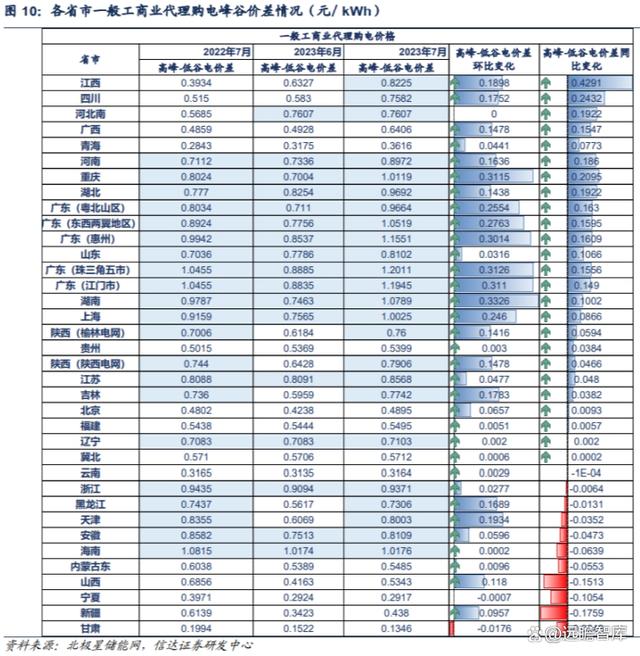 全國峰谷價差大于 0.7 元/kWh 的省份已達(dá) 19 個,且價差呈擴(kuò)大趨勢。0.7 元/kWh 為工商業(yè)儲能具備經(jīng)濟(jì)性的峰谷價差門檻值。數(shù)量變化上,2022 年 7 月至 2023 年 7 月,我國峰谷價差超過 0.7 元/kWh 的省份從 16 個增加至 19 個。價差變化上,共有 20 個地區(qū)的峰谷價差增大,如江西省從0.3934/kWh 提升至 0.8225/kWh,山東省從 0.7036/kWh 提升至 0.8102/kWh。各地峰谷價差普遍拉 大,意味著配置工商業(yè)儲能的套利空間擴(kuò)大。
