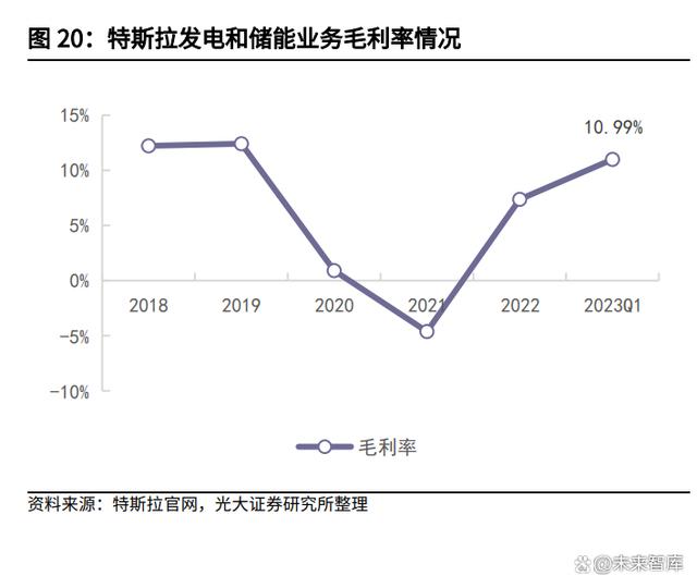 特斯拉發(fā)電和儲能業(yè)務(wù)營業(yè)收入除2019年外均穩(wěn)健增長,2020年到2022年增速均超過30%,發(fā)電和儲能業(yè)務(wù)毛利率在2019年-2021年有所下降,2022-2023第一季度明顯回升。在新能源大規(guī)模裝機和電網(wǎng)加大投資的背景下,家用級、商用級和公用級能源產(chǎn)品需求量不斷提升,儲能裝機量自2018年起逐年增加。2023年第一季度特斯拉該業(yè)務(wù)實現(xiàn)營業(yè)收入13.61億美元,同比增長148.21%,毛利率為10.99%。2023年4月,特斯拉宣布在中國上海新建儲能超級工廠(Megafactory),計劃于2024年第二季度投產(chǎn),初期規(guī)劃公用儲能電池年產(chǎn)量達1萬臺,儲能規(guī)模近40GWh,和2022年相比產(chǎn)能直翻六倍多,儲能市場前景廣闊。