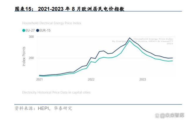 同電價歷史時期戶儲安裝量仍維持高速增長。根據(jù) HEPI,2023 年 8 月歐洲 27 國電價指數(shù) 185.80/氣價指數(shù) 166.52,與 2022 年年初水平接近,高于 2021 年及之前的水平。根據(jù) Solar power Europe 歷史數(shù)據(jù),2021 年歐洲戶儲新增戶儲裝機規(guī)模 2.294GWh,同增 106.9%。 當(dāng)前電價/氣價雖然較前期高點有下降,但儲能回報率仍較高,考慮到相較 2021 年,當(dāng)前 產(chǎn)品準(zhǔn)備更為多元,電池等原材料成本開始下降,用戶教育更為充分,歐洲戶儲仍有較高 增長動力。