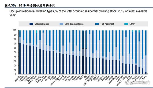 遠(yuǎn)期空間:美國房屋結(jié)構(gòu)具有天然優(yōu)勢,戶儲可利用屋頂面積高。戶用光伏和儲能設(shè)備通 常被安裝在家庭住房的屋頂上。因此,住房的類型、屋頂?shù)拿娣e大小等也直接決定了戶儲 的安裝難度和長期安裝需求,相對來說,獨立住房比高層樓房單戶房頂面積多,能夠安裝 更多戶儲,結(jié)構(gòu)也更適合當(dāng)前的分布式戶儲設(shè)備。根據(jù) OECD,美國 2019 年獨立住房和半 獨立住房的占比接近 70%,在統(tǒng)計的多個國家中排行第 6 名。根據(jù)美國經(jīng)濟(jì)分析局,2022 年美國人口 3.34 億,我們保守估計獨棟住房 6000 萬套,按 10%的滲透率、平均每戶 10kWh 計算,戶儲容量約為 600GWh,戶儲市場遠(yuǎn)期想象空間大。