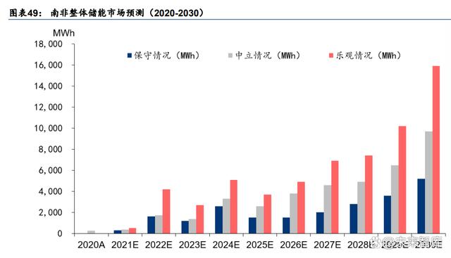 政策刺激疊加電力危機,南非戶儲市場增長預(yù)計有可持續(xù)性。為了緩解電力危機,南非政 府宣布 2023 與 2024 年全國電價將分別調(diào)漲 18.56%與 12.74%,以此來抑制居民用電需求。 從 23 年最新數(shù)據(jù)來看,23 年 1-7 月中國向南非出口逆變器累計 31.08 億元,同比+487.7%; 平均價格 2152.0 元/臺,同比 22 年 1-7 月+105.6%,中國出口南非逆變器價量雙升??紤] 到南非亦在跟隨全球腳步逐步擺脫煤炭發(fā)電依賴,燃煤電站大規(guī)模建設(shè)受阻,電力問題短 期無法解決,我們認(rèn)為南非儲能市場的高增速具有較好的持續(xù)性。根據(jù)世界銀行預(yù)測, 2020-2030 年南非儲能電池裝機的年復(fù)合增速在 34%-50%之間,在悲觀/中性/樂觀場景假 設(shè)下,2030 年南非儲能電池裝機量將達(dá)到 5.2/9.7/15.9GWh。