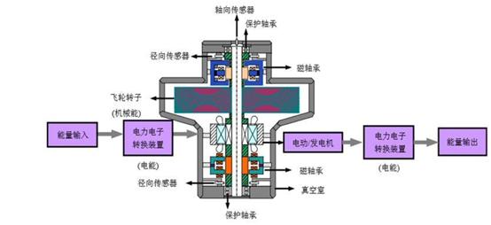 ——工作原理。飛輪儲能的原理是利用過剩電力給真空外殼中的轉(zhuǎn)子(飛輪)加速,把電能以動能的形式儲存。在儲能階段,通過電動機(jī)拖動飛輪,使飛輪本體加速到一定的轉(zhuǎn)速,將電能轉(zhuǎn)化為動能;在能量釋放階段,飛輪的旋轉(zhuǎn)速度會降低,電動機(jī)作發(fā)電機(jī)運(yùn)行,將動能轉(zhuǎn)化為電能。一般來說,飛輪系統(tǒng)使用電流來控制飛輪速度,其中高能的飛輪使用高強(qiáng)度碳纖維制成的轉(zhuǎn)子,并通過磁懸浮軸承實(shí)現(xiàn)懸浮。這些轉(zhuǎn)子在真空罩內(nèi)的轉(zhuǎn)速可達(dá)到20000-50000rpm,可以在幾分鐘內(nèi)達(dá)到所需的速度。