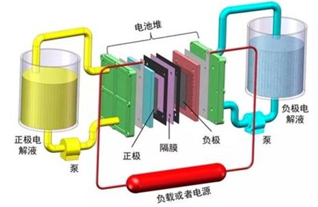 ——工作原理。液流電池通過離子選擇膜的離子交換將化學(xué)能轉(zhuǎn)化為電能,離子選擇膜將兩種液體電解質(zhì)分開存儲在不同的罐中,利用兩種化學(xué)溶液進(jìn)行離子交換來進(jìn)行充放電,其電壓一般在1.0-2.2V之間。與其它電池相似,液流電池的功率與隔膜面積成正比,而儲存能量的多寡和溶液儲存容量成正比。