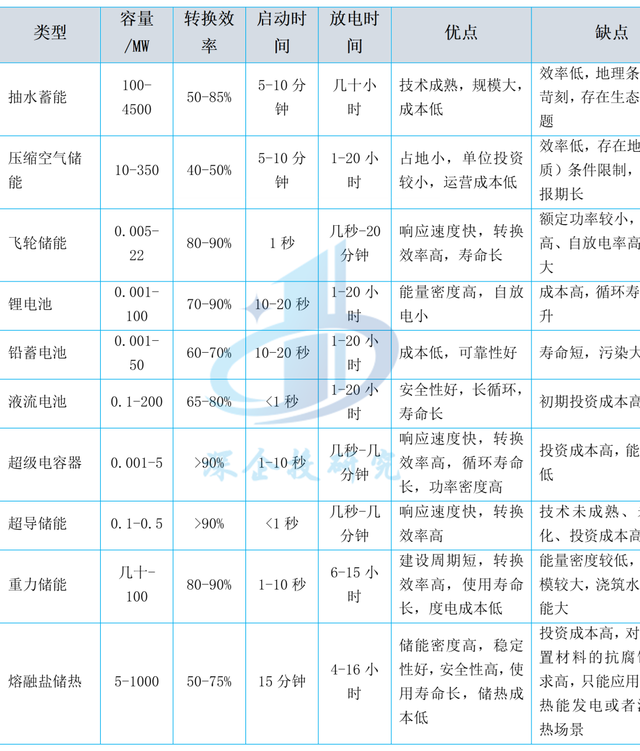 儲能技術(shù)呈現(xiàn)多元化發(fā)展格局,各有不同的應(yīng)用場景。每種儲能技術(shù)均具有一定的獨(dú)特性,在實(shí)際應(yīng)用中,需要用戶綜合考慮各種儲能技術(shù)的特點(diǎn)以及優(yōu)缺點(diǎn),選擇最適宜的技術(shù)方案。比如,飛輪儲能、超級電容、超導(dǎo)儲能可以解決秒級或分鐘級以下的調(diào)頻需求;抽水蓄能、壓縮空氣儲能、燃料電池和電化學(xué)儲能等則更適用于進(jìn)行小時(shí)級調(diào)峰;氫儲能適合執(zhí)行季節(jié)性調(diào)峰。不同儲能技術(shù)的特點(diǎn)如下表所示。