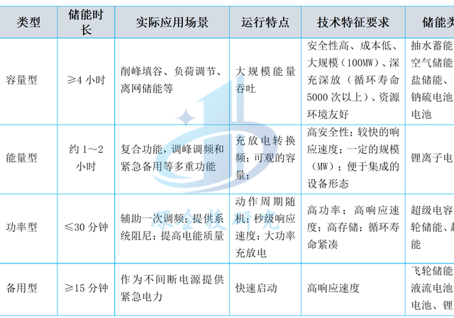 按照時(shí)長要求的不同,儲能的應(yīng)用場景可分為容量型(≥4小時(shí))、能量型(約1~2小時(shí))、功率型(≤30分鐘)和備用型(≥15分鐘)四類,對應(yīng)的應(yīng)用場景如下表所示。