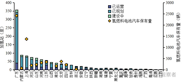 圖2 全國加氫站及氫燃料電池汽車保有量分布資料來源:根據(jù)氫能產(chǎn)業(yè)大數(shù)據(jù)平臺檢索所得(檢索時間2023年9月14)。注:部分省市尚無氫燃料電池汽車,故數(shù)據(jù)為零。