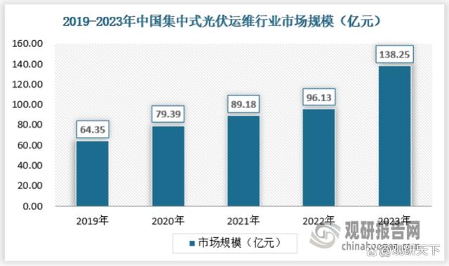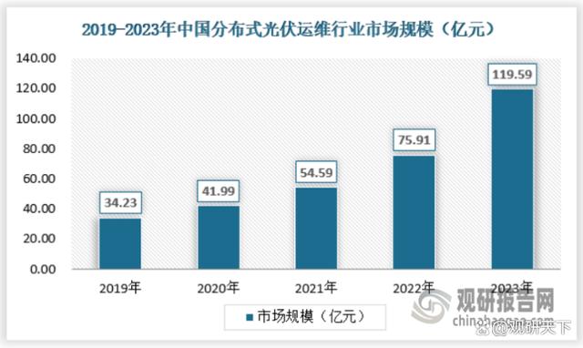2023年分布式光伏運維市場達到119.59億元。2023年新增分布式光伏裝機容量約為96GW,同比增長88.39%,2023年累計分布式光伏裝機容量約為254W,同比增長60.88%,因此2023年市場規(guī)模較2022年增長57.53%,具體如下: