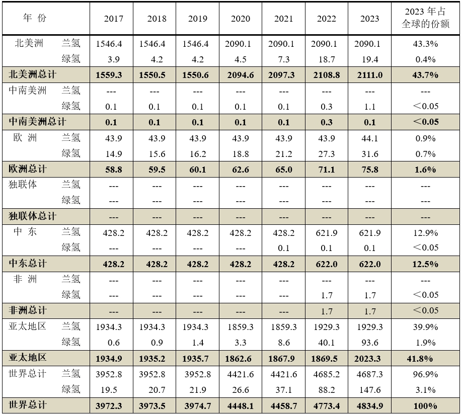 縱觀全球2023年氫氣生產(chǎn)仍然以從化石燃料制氫“蘭氫”為主,占96.9%,而從再生能源制氫“綠氫”為輔,僅占3.1%,再生能源制氫是發(fā)展方向,但中南美洲、獨(dú)聯(lián)體、非洲等地區(qū)的蘭氫沒有行動;獨(dú)聯(lián)體、中東和非洲的“綠氫”也沒有行動。