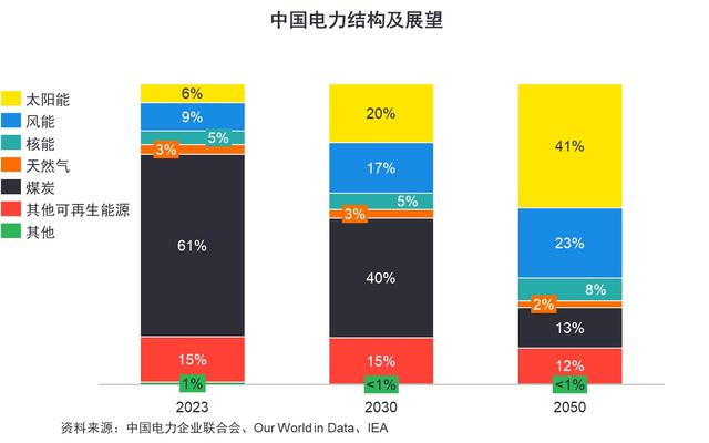 2023年,中國電力供應(yīng)結(jié)構(gòu)中傳統(tǒng)能源發(fā)電占比65%,可再生能源發(fā)電占比35%,其中光伏發(fā)電占比僅6%。據(jù)國際能源署(IEA)預(yù)測,2050年76%的電力供應(yīng)將來自于可再生能源,其中光伏占比為41%。屆時,光伏將成為中國構(gòu)建以新能源為主的新型電力系統(tǒng)的核心力量之一。
