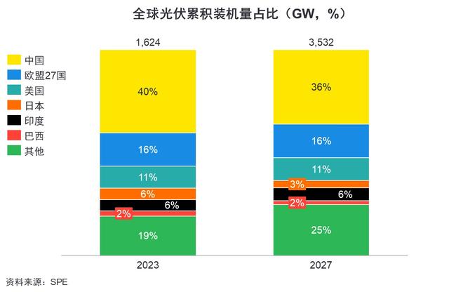 據(jù)歐洲光伏協(xié)會(SPE)數(shù)據(jù)顯示,2023年全球光伏裝機總量已達1624吉瓦,在中等情景預(yù)測下,2027年全球裝機總量將顯著增長至3532吉瓦,復(fù)合增長率將高達21%。從區(qū)域來看,2023年中國以656吉瓦的光伏累計裝機容量穩(wěn)居全球第一,占比為40%,歐盟和美國緊隨其后,裝機容量分別為263吉瓦、173吉瓦。根據(jù)歐洲光伏協(xié)會(SPE)預(yù)測,到2027年,全球光伏裝機格局預(yù)計保持不變。值得關(guān)注的是,過去幾年,中國、美國和巴西的光伏裝機容量增長速度均超過了全球平均增速27%,其中巴西光伏因其裝機容量基數(shù)較小,其增速更是達到了74%的驚人速度。