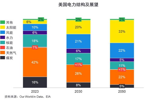 作為以油氣為主的能源大國,2023年美國電力供應(yīng)結(jié)構(gòu)中傳統(tǒng)能源發(fā)電占比59%,新能源發(fā)電占比41%,其中光伏發(fā)電占比僅6%。這距離美國“3550”計劃[2]中提出的2035年實現(xiàn)無碳發(fā)電的目標還有很大距離。對美國而言,發(fā)展光伏是其能源結(jié)構(gòu)調(diào)整的重要一環(huán),也是進一步穩(wěn)固其能源強國地位的必要手段。據(jù)美國能源署(EIA)預(yù)測,到2030年,66%的電力供應(yīng)將來自于新能源,其中光伏占比提升至20%,到2050年,73%的電力供應(yīng)將來自于新能源,其中光伏占比大幅提升至33%。